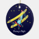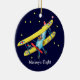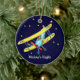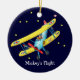 Ornamento de cerámica con el ilustracion de un biplano del dibujo animado. El piloto del niño toma un vuelo así como el perro y el gato. ¡Ponga su propio texto en el ornamento y elija su propio color de fondo! Gran ornamento a colgar en el sitio de un niño.