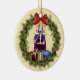 Hermoso rey del ratón desde el petardo en ornamento redondo de corona. Este adorable adorno de cerámica de arte vacacional de doble cara cuenta con un bonito personaje de rey del ratón del ballet nutcracker en el centro de una corona de vacaciones con pinos y bayas. ¡Una maravillosa adición a tu colección de ornamentos o decoración de vacaciones y un gran regalo para la familia, amigos y alguien que ama al petardo, al rey del ratón o colecciona objetos de desnudo!