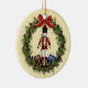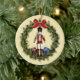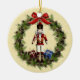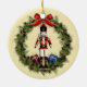 Hermosa muñeca de petardo rojo en ornamento redondo de flores. Este adorable adorno de cerámica de arte vacacional de doble cara cuenta con un petardo rojo en el centro de una corona de vacaciones con pinos y bayas. Una maravillosa adición a tu colección de adornos o decoración de vacaciones y un gran regalo para la familia, amigos y alguien que ama al petirador!