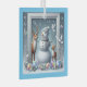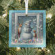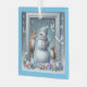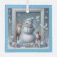 En un retrato gris claro que enmarca a un muñeco de nieve muy bien formado en un Blizzard con un Tobogán gris y una bufanda mientras dos venados y dos palomas de tortuga blanca miran, todo rodeado de burbujas transparentes multicolor flotando.