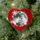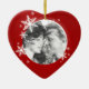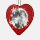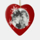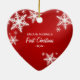 Ornamento navideño personalizado en forma de corazón con diseño moderno con copos de nieve blancos de invierno en rojo, foto redonda y texto personalizado en la parte posterior. ¡Un hermoso recuerdo para tu primera Navidad juntos! Personalízalo con tu foto y texto personalizado en la parte posterior o personalizar más adelante si deseas ajustar el diseño en ambos lados o elegir una forma de adorno diferente.
