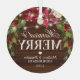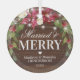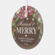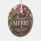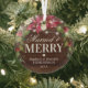 Nuevo ornamento de navidad de vidrio mr & mrs con un fondo rústico de efecto de madera, elegantes flores de navidad y follaje de color agua, luces de trineo de cuerdas, el dicho ‘casado y alegre', un corazón lindo, tu nombre(s), apellido(s) y año.