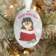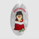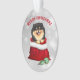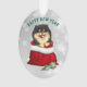 Un adorable y pequeño pomerano negro sale de una bolsa de regalo roja en la parte delantera de este adorno navideño. Unas pocas bombillas verde azuladas y doradas de árboles de vacaciones yacen justo delante de la bolsa de Santa. El texto encima de la imagen dice "FELIZ NAVIDAD" en rojo. La imagen y el texto se colocan en un fondo de bokeh abstracto plateado. La parte posterior del adorno tiene la misma imagen, pero con el texto "AÑO NUEVO FELIZ" en verde verde azulado.