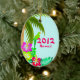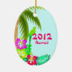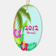 Árbol de Navidad colorido / adornos cerámicos decoradores, con gráficos de una escena tropical de flores de hibisco, palmeras y loro de macao. El texto rosa brillante dice el año y Hawaii. El texto se puede cambiar para leer lo que quieras. Gran adorno de recuerdo.