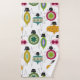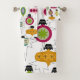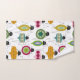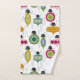 Este juego de toallas tiene un diseño Navidad moderno de mediados de siglo con adornos de estrellas grises en la parte trasera.