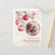 Luminosos tonos rosas, rojos y malvas contrastan con el blanco para mostrar algunos adornos decorados con gusto colgando de las ramas de un árbol de Navidad festivo en esta hermosa acuarela vintage. La postal de vacaciones muestra la foto seleccionada en la parte delantera. También está el sentimiento, "Te deseamos una feliz Navidad", que puedes editar. Además, asegúrese de cambiar el nombre de la familia de ejemplo y el año por el suyo propio. En el reverso de la postal hay un ejemplo de párrafo de saludos y firmas. Edite esto en el tuyo. Si desea que este lado de la postal esté en blanco, simplemente elimine el texto de la entrada. También hay espacio para una etiqueta de dirección de retorno.