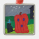 Dibujo artístico de una calabaza con una cara fantasma y un gato negro con un gorra mago azul, está impreso en ornamentos.