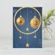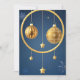 Elegantes Navidades dorados baubles y estrellas suspenden sobre un fondo azul con diseños de copos de nieve, presentando un ánimo festivo.