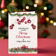 Envíe saludos cálidos de vacaciones con esta elegante tarjeta de Navidades que incluye adornos rojos festivos y guirnaldas de pinos acentuados por la vegetación de las vacaciones. El audaz mensaje de "Feliz Navidad" lo hace perfecto para familias, amigos o saludos profesionales. Personalice su nombre o los detalles de su familia para que le den un toque agradable.