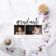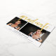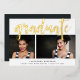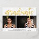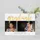 Una moderna invitación de graduación con dos de tus retratos favoritos o fotos de graduación alineadas una al lado de la otra, con "graduado" cubierto de letras dibujadas a mano en Relieve metalizado dorado. Personalice la parte delantera con el nombre del graduado, la escuela y el año de clase, y añada un mensaje personal al dorso.