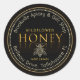 Etiqueta negra con la palabra HONEY escrita y reflejada en oro metálico sobre fondo negro con doble dorado y borde punteado. Ilustracion de contorno de abejas vintage. Lista precalculada de conversiones de peso neto de miel. Texto editable en un borde curvo para el nombre de Apiario o de Beekeeper, y ubicación de negocio.