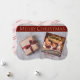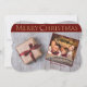 Un moderno diseño de tarjetas de Navidades cristianos con tu foto familiar y nombres junto a un regalo de Navidades envueltos en oro con cinta roja para Navidades. Dorado resplandeciente Feliz Navidad en un cartel rojo en la parte superior. Patrón personalizado de Feliz Navidad en la espalda.