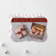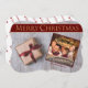 Un moderno diseño de tarjetas de Navidades cristianos con tu foto familiar y nombres junto a un regalo de Navidades envueltos en oro con cinta roja para Navidades. Dorado resplandeciente Feliz Navidad en un cartel rojo en la parte superior.