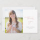 Esta tarjeta de agradecimiento de graduación minimalista presenta una foto grande y letra de escritura informal. "Gracias" está escrito en escritura moderna de oro rosa, con el nombre del graduado y el año de graduación debajo en gris. A la izquierda, agregue una foto grande del nuevo graduado. La parte trasera está en blanco y puede acomodar fotos adicionales o una nota personalizada para los destinatarios.