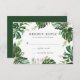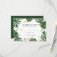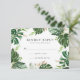 Elegantes tarjetas RSVP de bodas tropicales con sus detalles bodas rodeados por un borde de hojas de monstera color agua, Relieve metalizado de oro falso y follaje verde. Las tarjetas de respuesta boda se invierten a un fondo tropical sólido. Diseñado para coordinar con nuestra colección de bodas Tropical Gold.