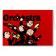 Fondo rojo con los esquemas negros finos de círculos concéntricos detrás de un grupo de jugar y de la palabra "orquesta" de los músicos arriba.