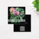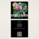 Una tarjeta de visita con fondo negro con flores de orquídea y hojas de monstera.