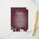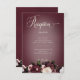 Disfrute de una exquisita elegancia gracias a nuestra floral tarjeta de recepción de bodas oscura y monótona. Diseñada para cautivar a los sentidos, esta invitación tiene un impresionante fondo burdeos adornado con una impresionante ráfaga de rosas de borgoña y crema, hortensias grises de lavanda pálida y otras flores mixtas de color blanco suave y rosa pálido, complementadas con un frondoso follaje verde oliva. El texto cremoso flota delicadamente sobre un suave soplo de luz, añadiendo un toque de romanticismo al encanto general. Aproveche la opulencia de la temporada y fije el tono de su día especial con este impresionante diseño, seguro que dejará una impresión duradera a sus huéspedes. Creado por Simply Farmhouse Press.