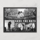 Personalizar esta elegante y moderna tarjeta postal Guardar la boda de fecha diseñada con texto en negrita en gris oscuro / negro. Reemplace el collage de cuatro imágenes de plantilla con sus 4 fotos favoritas. Una de las imágenes es una gran foto panorámica horizontal y las otras tres son más pequeñas. Para obtener mejores resultados, utilice fotos de alta resolución. También cambie toda la información de la plantilla en ambos lados con la suya propia. Este diseño tiene una frase: "¡Nos vamos a casar! (Con tu fecha de matrimonio) Y te encantaría guardar la fecha para poder compartir en nuestro día especial. Invitación formal a seguir." puede cambiar las palabras con las suyas.