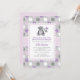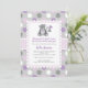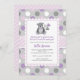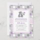 Esta tierna invitación a la ducha de una niña cuenta con un oso de peluche dulce sosteniendo globos con fondo de punto polka en color morado y gris.