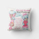 Almohada de la invitación del nacimiento del bebé en rosas y azules. Esta almohada linda tiene pequeño un globo del oso de peluche lindo y del aire caliente y le sostendrá información de los bebés en una almohada personalizada del recuerdo del bebé. Añada toda la información del nacimiento de los bebés a esta almohada.