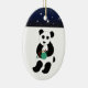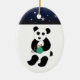 Una noche estrellada y un pequeño oso panda se sienta sosteniendo un adorno verde brillante con cintas en sus patas.