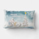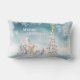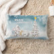 Nuestra almohada favorita -una almohada lumbar cómoda- con un adorable tema de Navidades, un trío de osos polares, adornados con accesorios de invierno y listos para celebrar a los Navidades en la nieve, junto a un árbol de Navidad con las palabras Feliz Navidad en negrita.