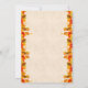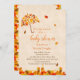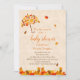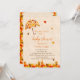 Una invitación perfecta para una ducha de bebé de temática otoñal con un paraguas hecho de hojas de color ocaso contra un fondo bronceado. Hay un borde inferior de hojas de otoño coloridas y la parte posterior presenta las hojas en ambos lados.