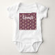 Este traje de bebé tiene un diseño art deco de ovales, rectángulos y círculos en líneas horizontales que se repiten en filas.