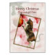 Una tarjeta de Navidades divertida que muestra a un gato calico parado en patas traseras y jugando con una decoración de bola roja en un árbol de Navidad. Dentro de la tarjeta hay una foto de un gato con un Sombrero de Santa. Una tarjeta de diversión para mandar a amigos o familiares amantes del gato.