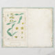 Página de revistas de basura de época con ilustracion de flores silvestres botánicas amarillas en la parte delantera y ilustracion de flores silvestres blancas en la parte trasera. Páginas verde azuladas de fondo y pergamino con etiquetas doradas, cinta y detalles de cosido en el centro. Doblar a la mitad para crear páginas del diario.