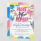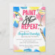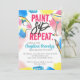 Lleve una divertida noche de chicas con una despedida de soltera de pintura y sorbo llena de colores y muchas bebidas adultas. El diseño presenta tipografía "pinta. sip.Repeat" así como detalles que simplemente puedes personalizar con tu nombre e información de fiesta. Con salpicaduras de pintura con manchas de pintura amarillas, rojas y azules, paleta de pintura pintada a mano, pincel de pintura y vidrio.