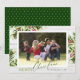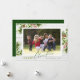 Esta tarjeta de Navidad campestre presenta una foto horizontal sobre un fondo de tablones de madera blanca acentuado con hermosas ramas de pino en acuarela y bayas rojas. El saludo "Feliz Navidad" aparece en verde brillante y verde oscuro. La parte posterior es de color verde oscuro con un patrón de puntos brillantes en verde. Personaliza esta tarjeta con el nombre de tu familia y año. Fotografía © Storytree Studios, Stanford, CA