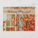El otoño deja un país rústico. Hemos movido la postal de la invitación. Envíe su nueva dirección a su familia y amigos. Hermosos colores de hojas naranjas, rojas y amarillas trepando por el costado de la casa. Vintage retro antiguo ventana blanca y obturador azul. Foto de la casa de ladrillo marrón, derechos reservados Marg Seregelyi Photography.