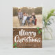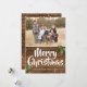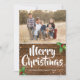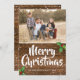 Tarjeta de vacaciones de navidades de moda rural con fondo rústico de madera, foto familiar para personalizar con uno de sus propios festividades, ducha de nieve, las palabras "feliz navidad" en una caligrafía y saludos de temporada debajo.