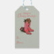 Esta etiqueta de regalo To/From, un país festivo, muestra un par de botas de navidades de vaquera dibujadas a mano, sentadas entre pinecones, pinos y bayas huecas en el frente. La parte posterior presenta un patrón divertido con estos mismos elementos occidentales. Elegante fondo verde sabio.