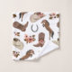 Patrón de acuarela de campo y floral con gorras de vaquero, botas de vaquero, herraduras, caballos y flores.