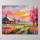 Un vibrante paisaje abstracto moderno de una casa de campo en otoño, con cálidos tonos de naranja, rosa y oro con pinceles abstractos expresivos y expresivos. La composición dinámica captura la belleza de la caída, evocando la serenidad de una escena campestre. Los colores audaces y el lavado fluido crean una sensación de movimiento y energía, dándole a esta pieza un giro contemporáneo a un paisaje rural clásico.