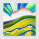 Diseño del paisaje de acuarela digital en colores vivos de arcoiris y texturas con amanecer y rayas de sol sobresalientes.