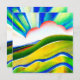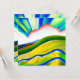 Diseño del paisaje de acuarela digital en colores vivos de arcoiris y texturas con amanecer y rayas de sol sobresalientes.