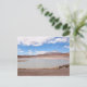 Postal de un paisaje con un lago y un volcán nevado en el Altiplano en las montañas de los Andes en la frontera entre Bolivia y Chile.