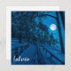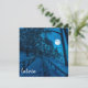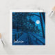 Paisaje invernal con pinos cubiertos de nieve y abetos a la luz de la luna en noche estrellada con luna llena. Vista del bosque de coníferas con sendero de madera cerca de la costa del mar con hermoso cielo nocturno con estrellas