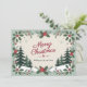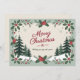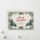 Una vintage tarjeta de felicitación navideña que evoca un ambiente sereno y acogedor, adornada con un delicado borde de hojas, bayas y ramas de pino que enmarcan un paisaje nevado con abetos, todo ello en tonos suaves de rojo intenso, verde bosque y crema antigua, complementado con copos de nieve y puntos de polka.