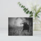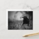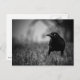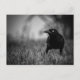 Una postal con una fotografía en blanco y negro de un pájaro negro en el césped.