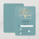 Tarjeta RSVP con un fondo verde apagado superpuesto encima es un árbol amarillo claro con 2 siluetas de pájaros naranja posados en las ramas.