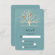 Tarjeta de RSVP con un fondo verde apagado superpuesto encima es un árbol amarillo claro con 2 siluetas de pájaros naranja sentados en las ramas.