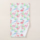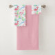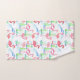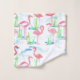 Una toalla con tema de un estanque con un patrón de flamencos rosados brillantes que recorren un estanque ilustrado con acentuación con una sólida toalla de baño rosa caliente.