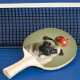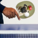 Gracioso Pug con una manzana balanceándose encima de su cabeza.