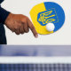 Ping pong remo con la bandera de Ucrania, una bandera azul y amarilla con el escudo de armas ucraniano (emblema) con un tridente en el centro