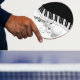 Teclado clásico blanco y negro con un toque curvo. Las notas musicales agregadas le dan un aspecto festivo.